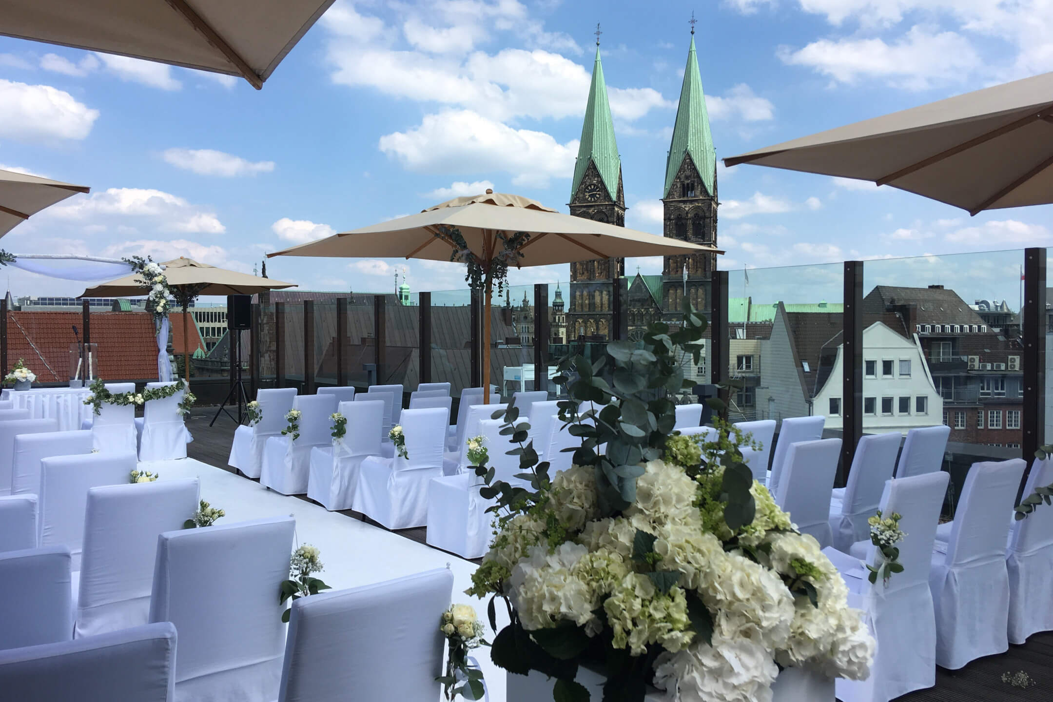 Unsere Hochzeitsplaner machen Ihre Träume wahr: Sie möchten unter freiem Himmel auf unserer Dachterrasse getraut werden? Wird organisiert. Sie möchten Ihre Gäste in unseren Zimmern und Suiten unterbringen? Sind reserviert. Sie benötigen modernste Veranstaltungstechnik mit Beamer und Leinwand? Alles da. Sie möchten eine spezielle Dekoration oder Musik? Sprechen Sie einfach mit uns – wir kümmern uns um alles, was Ihren schönsten Tag noch schöner macht.