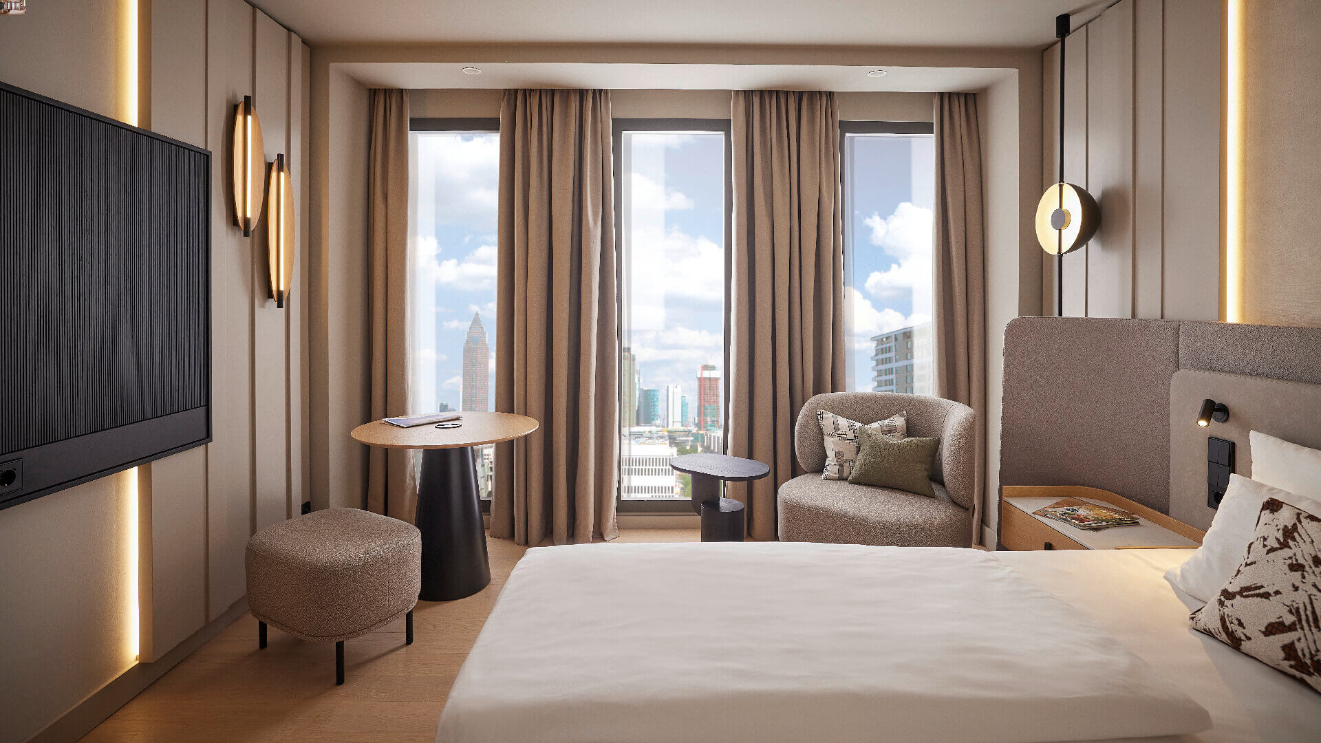 Unsere Skyline Zimmer verbinden modernen Komfort mit stilvollem Ambiente. Genießen Sie den beeindruckenden Ausblick auf die Skyline der Stadt, sowohl tagsüber im Sonnenlicht als auch abends in stimmungsvoller Atmosphäre.